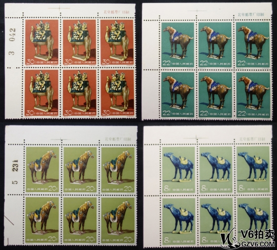 名稱: Lot95-171: 特46唐三彩 6方聯(lián)一套 帶角邊廠銘 微黃 邊齒微折 上品