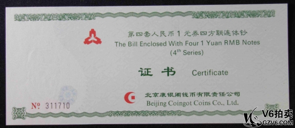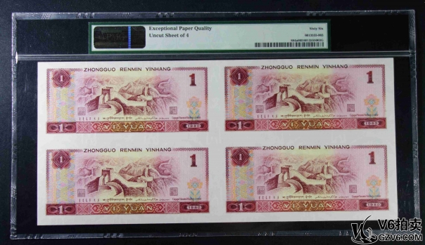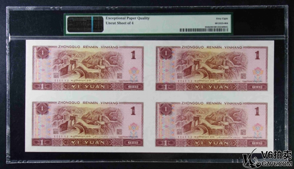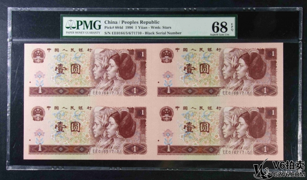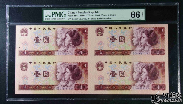 名稱: Lot95-238: PMG-66EPQ/66EPQ*2-四版人民幣壹圓四方連體鈔一套 EE0164/5/6/71710 帶冊證